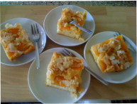 Aprikosenkuchen vom BlechZutaten:2 Dosen Aprikosen (á 850 ml)250 g weiche Butter oder Margarine200 g Zucker2 P. Vanillin-Zuckerabgeriebene Schaler von 1 Zitrone1 Prise Salz4 Eier (Größe M)75 g Speisestärke250 g Mehl75 g gemahlene Mandeln2 TL Backpulver75 g Mandelblättchen150 g Puderzucker3-4 EL ZitronensaftFett und Mehl für das BlechZubereitung:Aprikosen gut abtropfen lassen. Fett, Zucker, Van.-Zucker, Zitronenschaft und Salz cremig rühren.Eier einzeln zugeben und gut unterrühren. Mehl, gemahlene Mandeln und Backpulver mischen und kurz unterrühren. Teig auf eingefettetes und bemehltes Backblech streichen. Aprikosen darauf verteilenund mit Mandelblättchen bestreuen. Im vorgeheizten E-Herd bei 175 Grad 40 – 45 Minuten backen.Guss:Puderzucker , Zitronensaft und 1 EL heißes Wasser verrühren. Guss sofort über den gebackenenKuchen streichen.